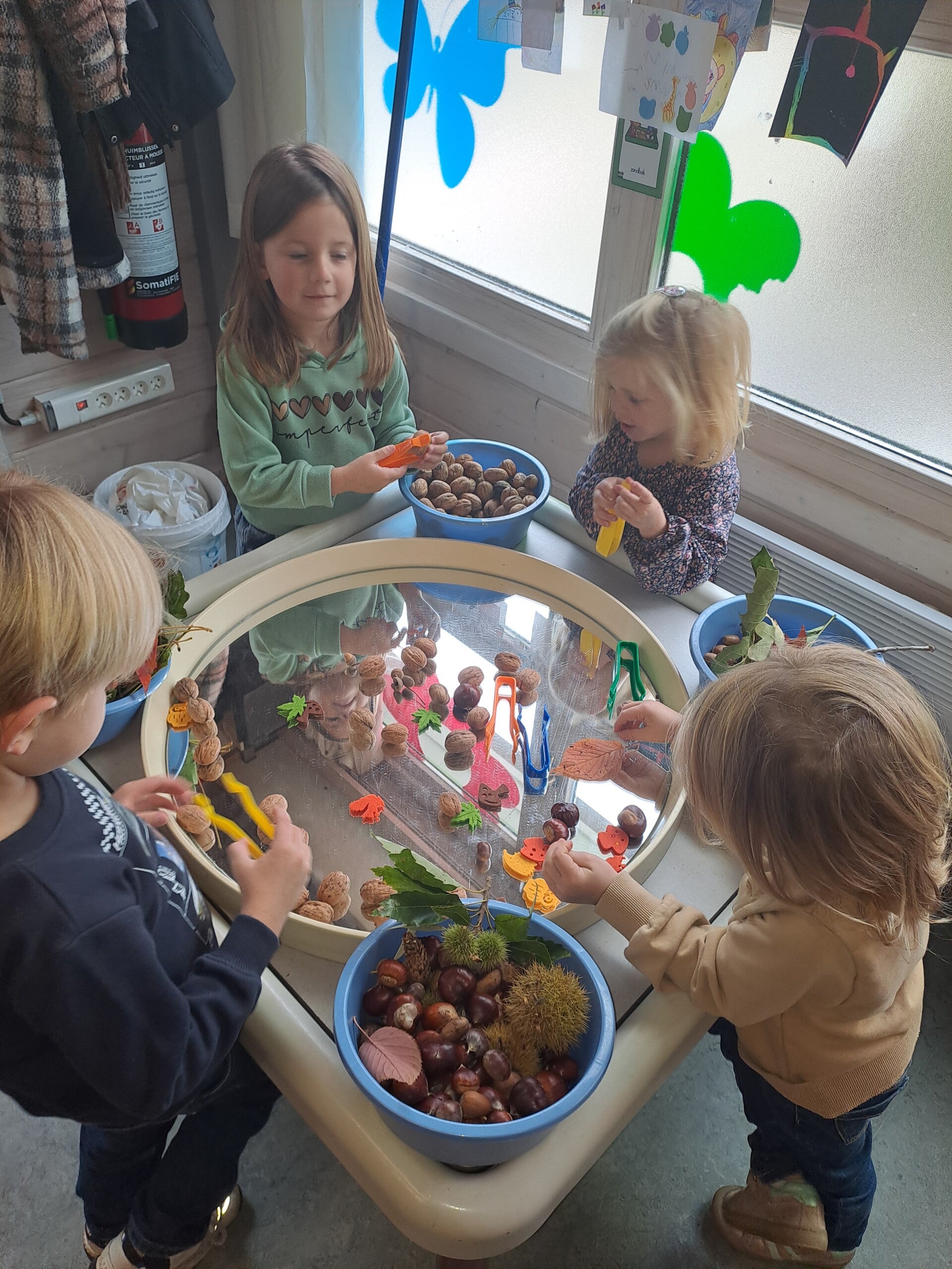 Herfstblaadjes, herfstvruchten, diertjes en paddenstoelen overal