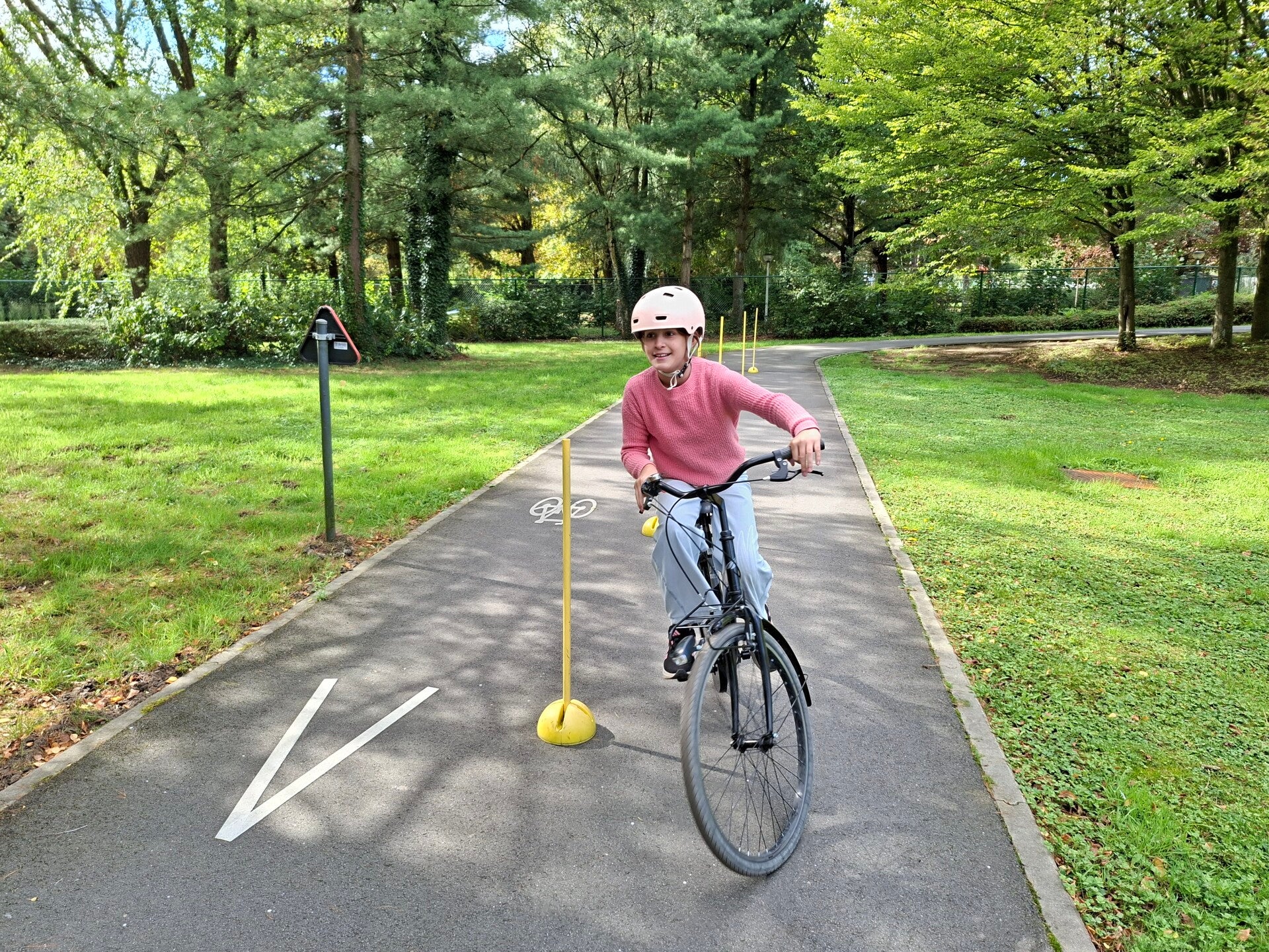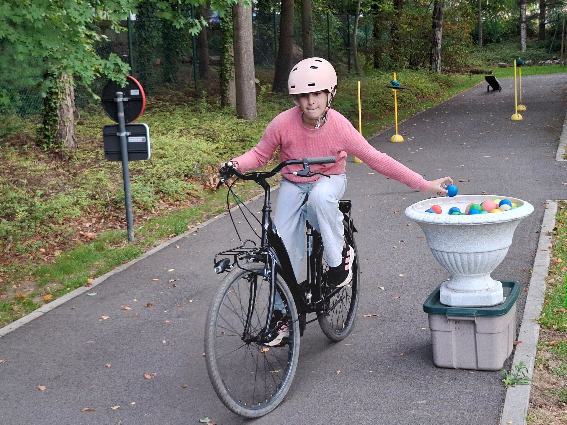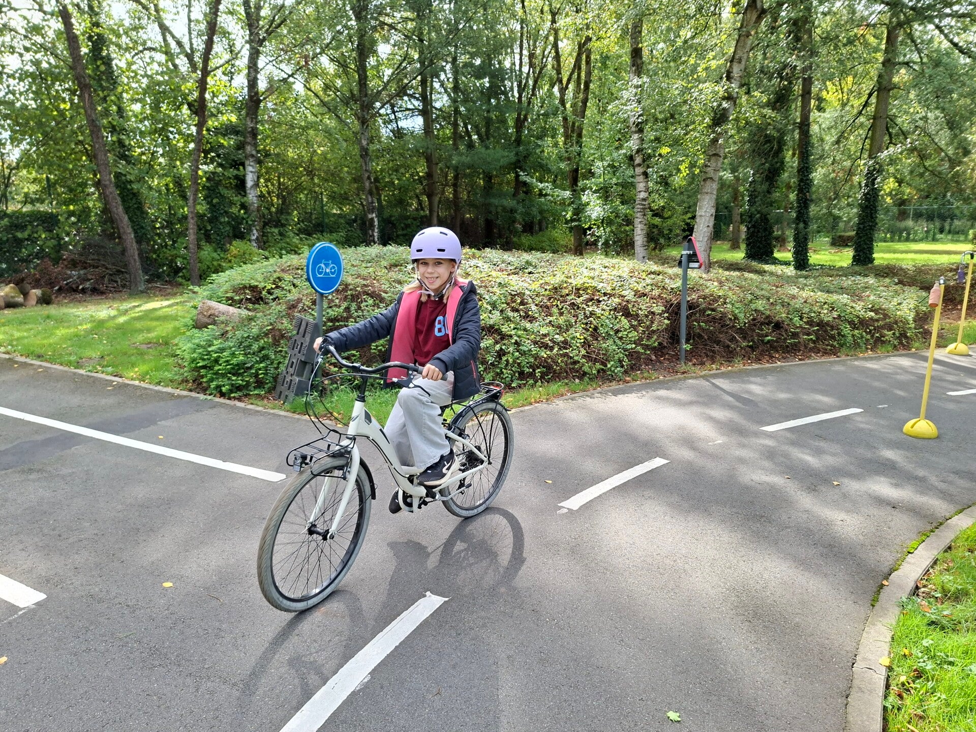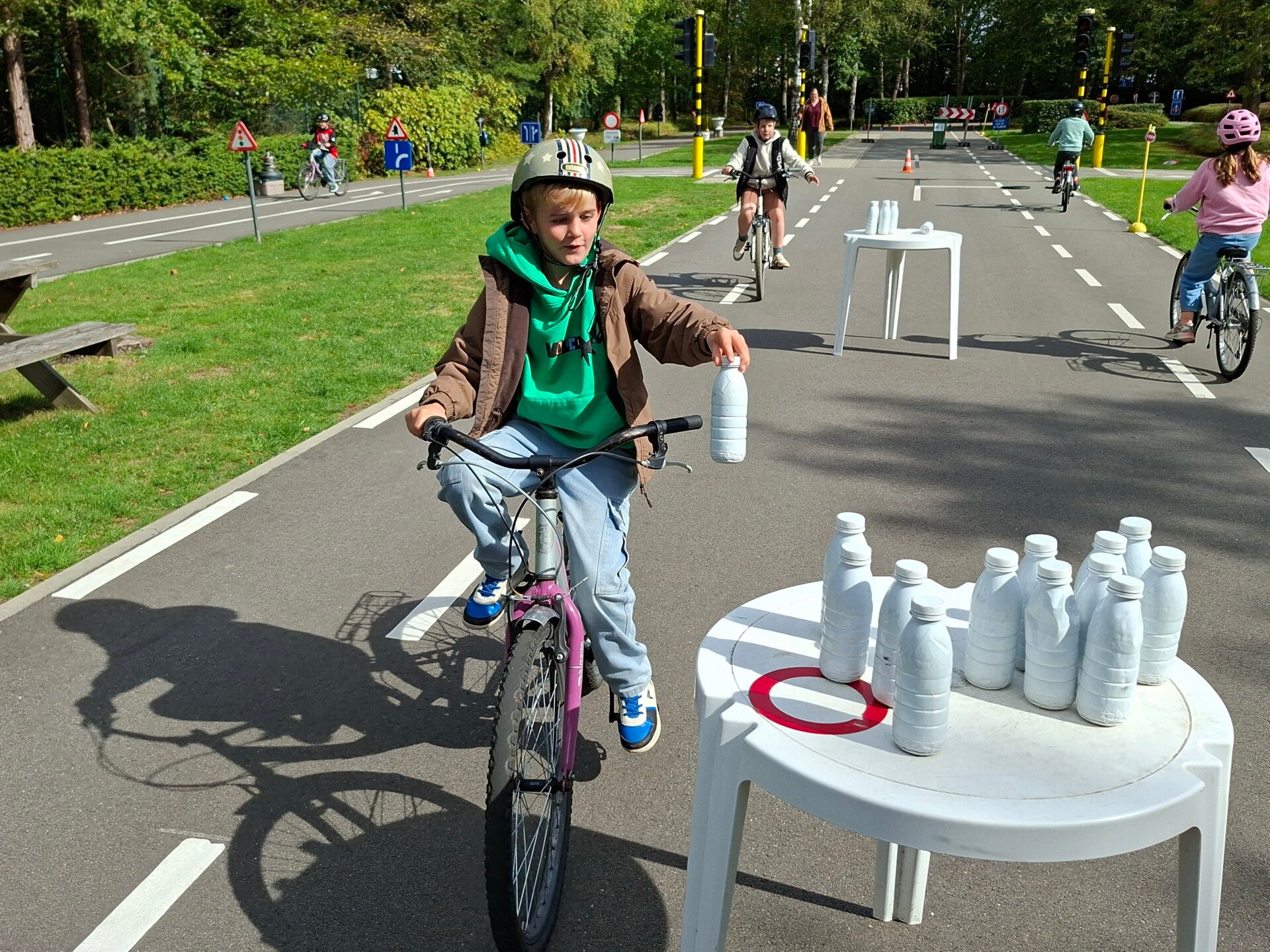 In het verkeerspark oefenden we op fietsbehendigheid. We legden een parcours af waarbij we flesjes van plaats moesten veranderen, plastic eendjes in een emmertje moesten gooien, ... Een heel nuttige oefening!