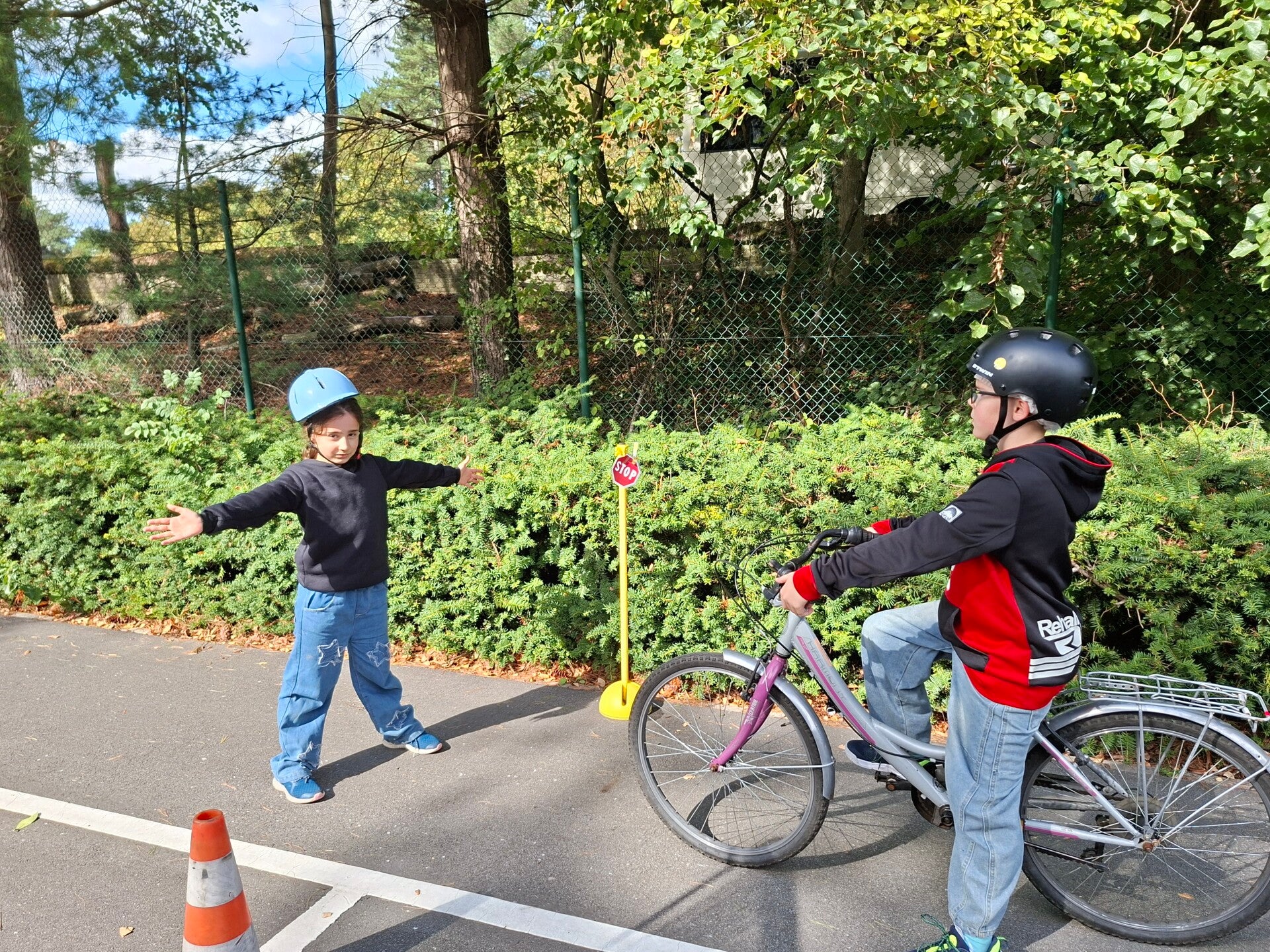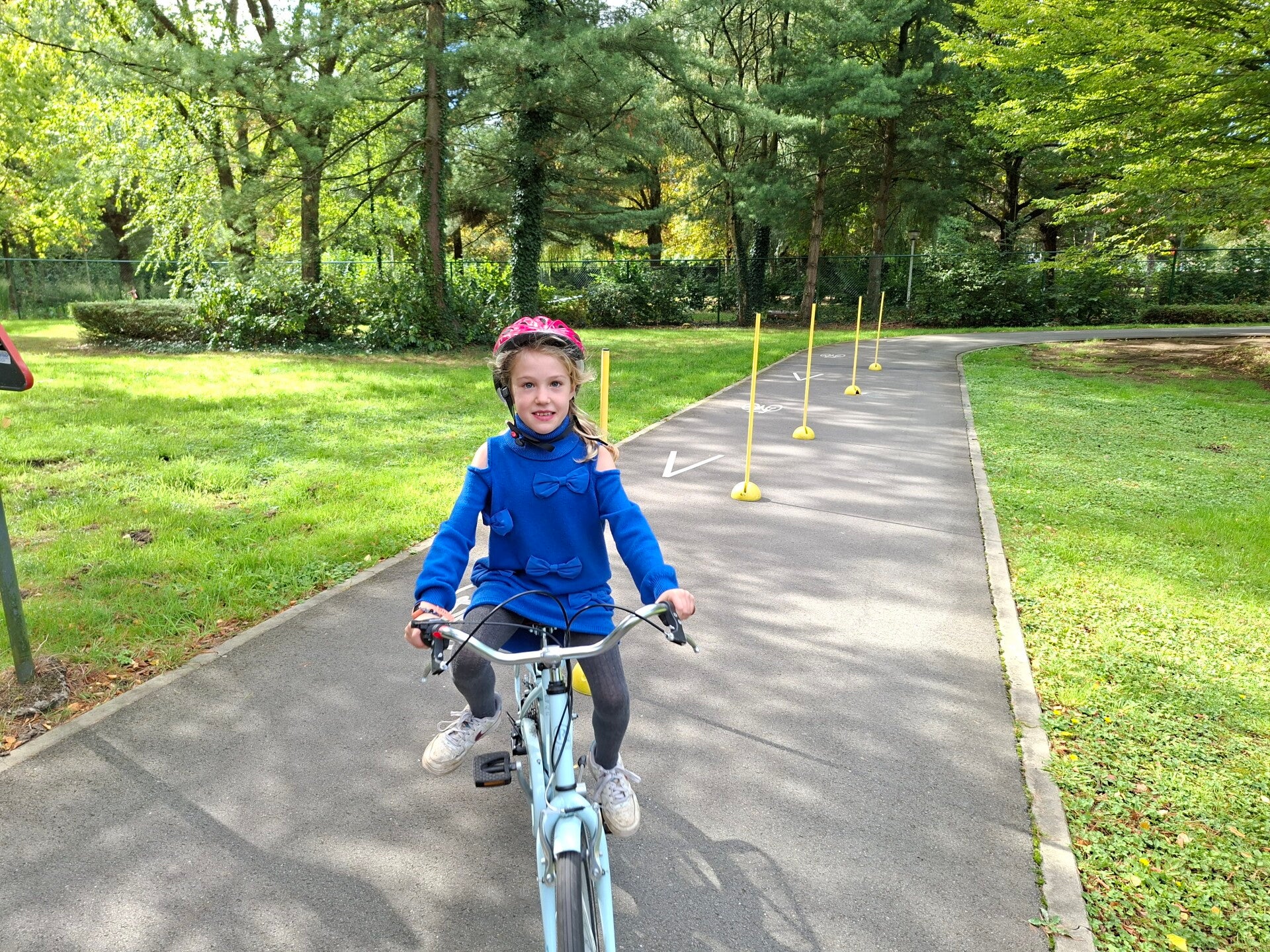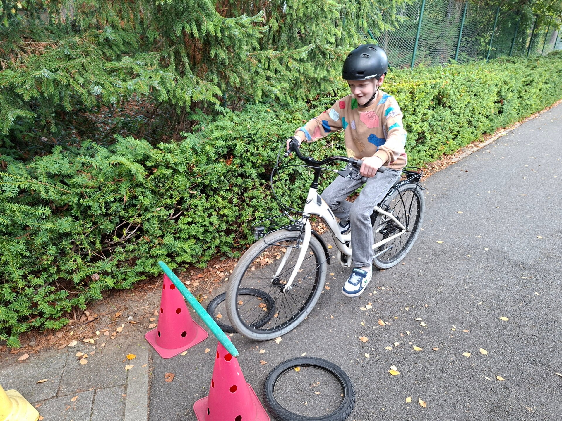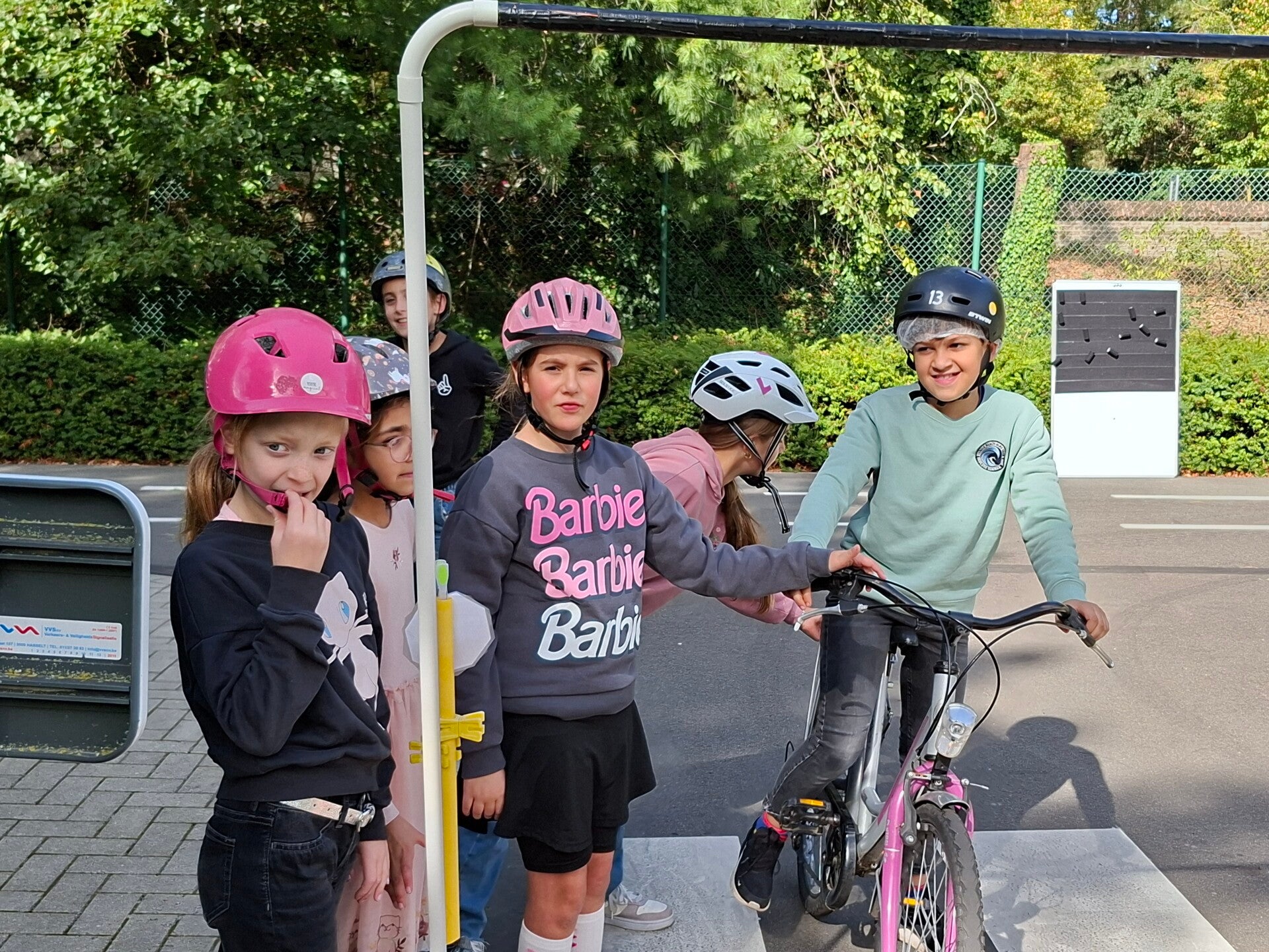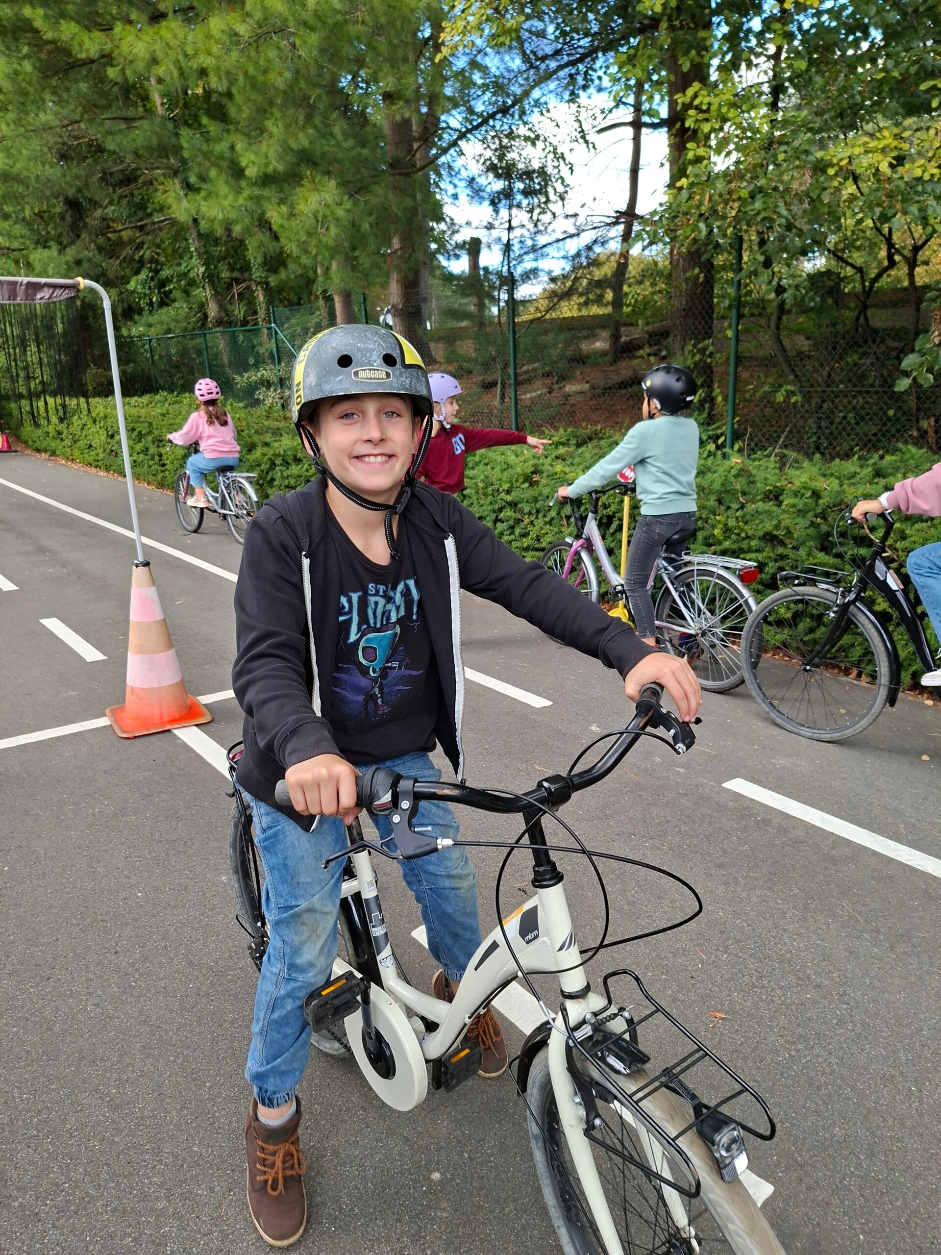 In het verkeerspark oefenden we op fietsbehendigheid. We legden een parcours af waarbij we flesjes van plaats moesten veranderen, plastic eendjes in een emmertje moesten gooien, ... Een heel nuttige oefening!