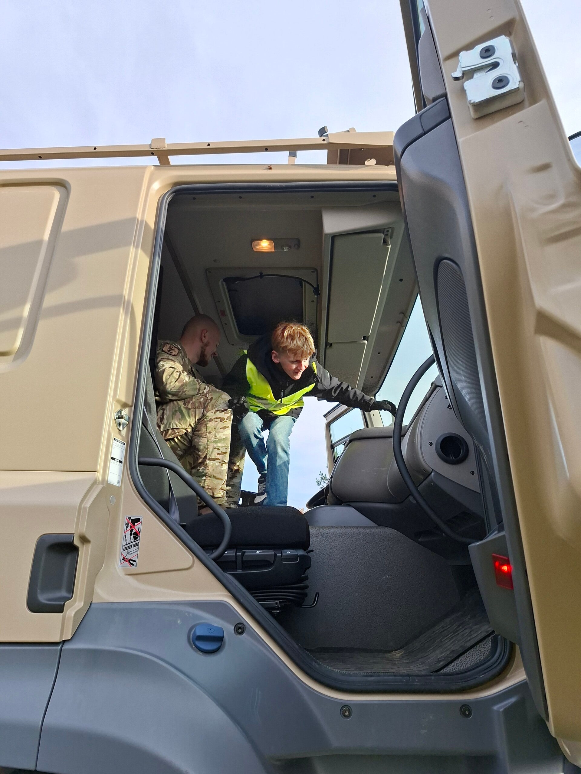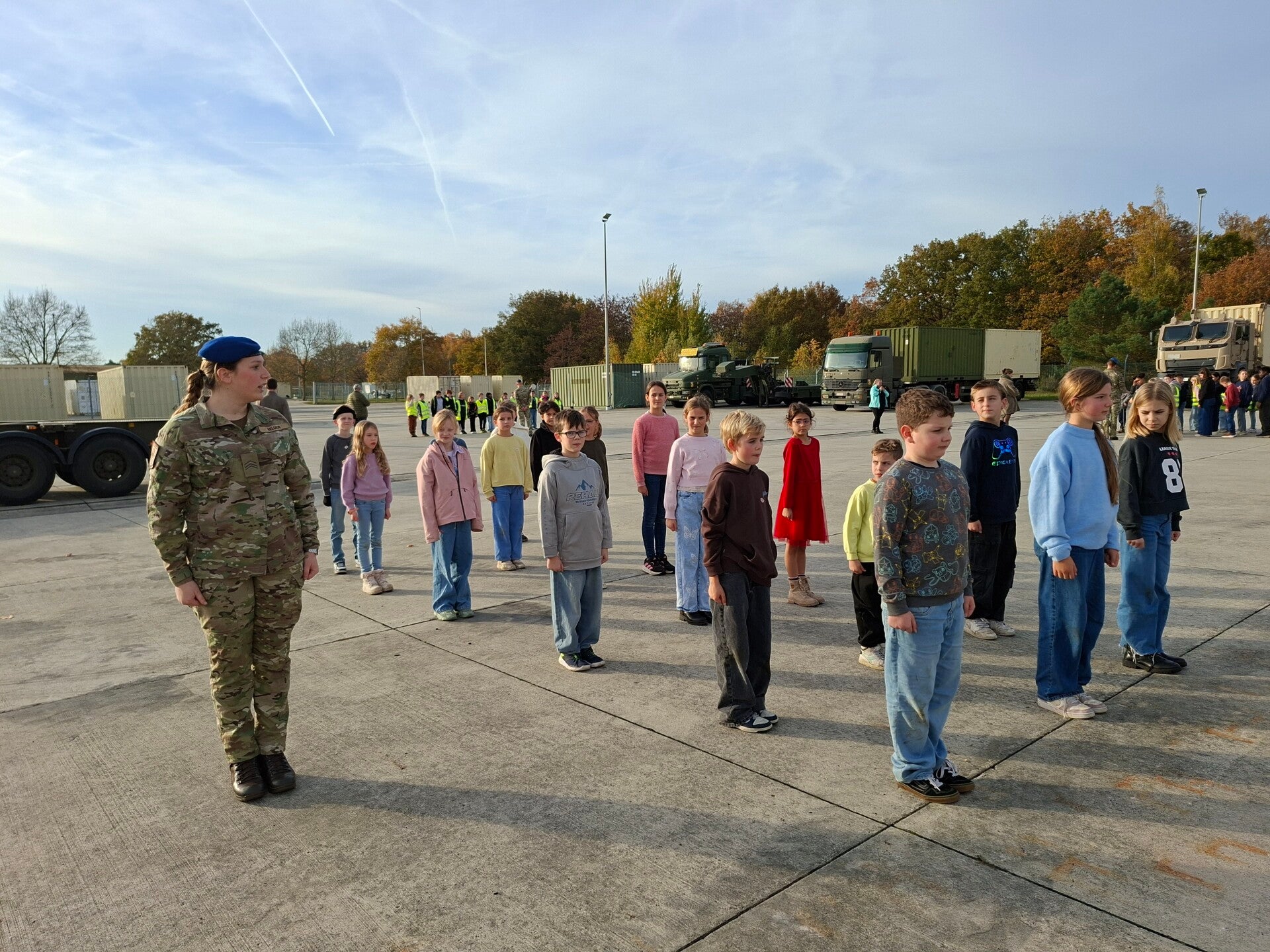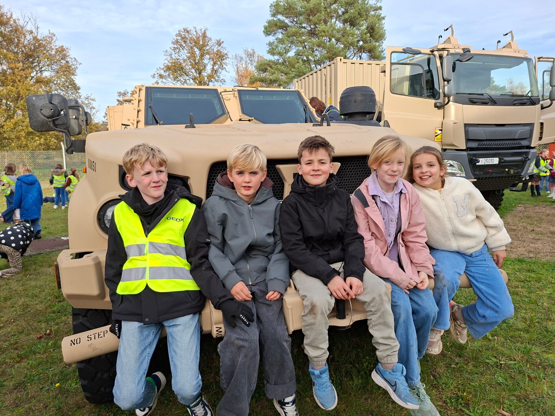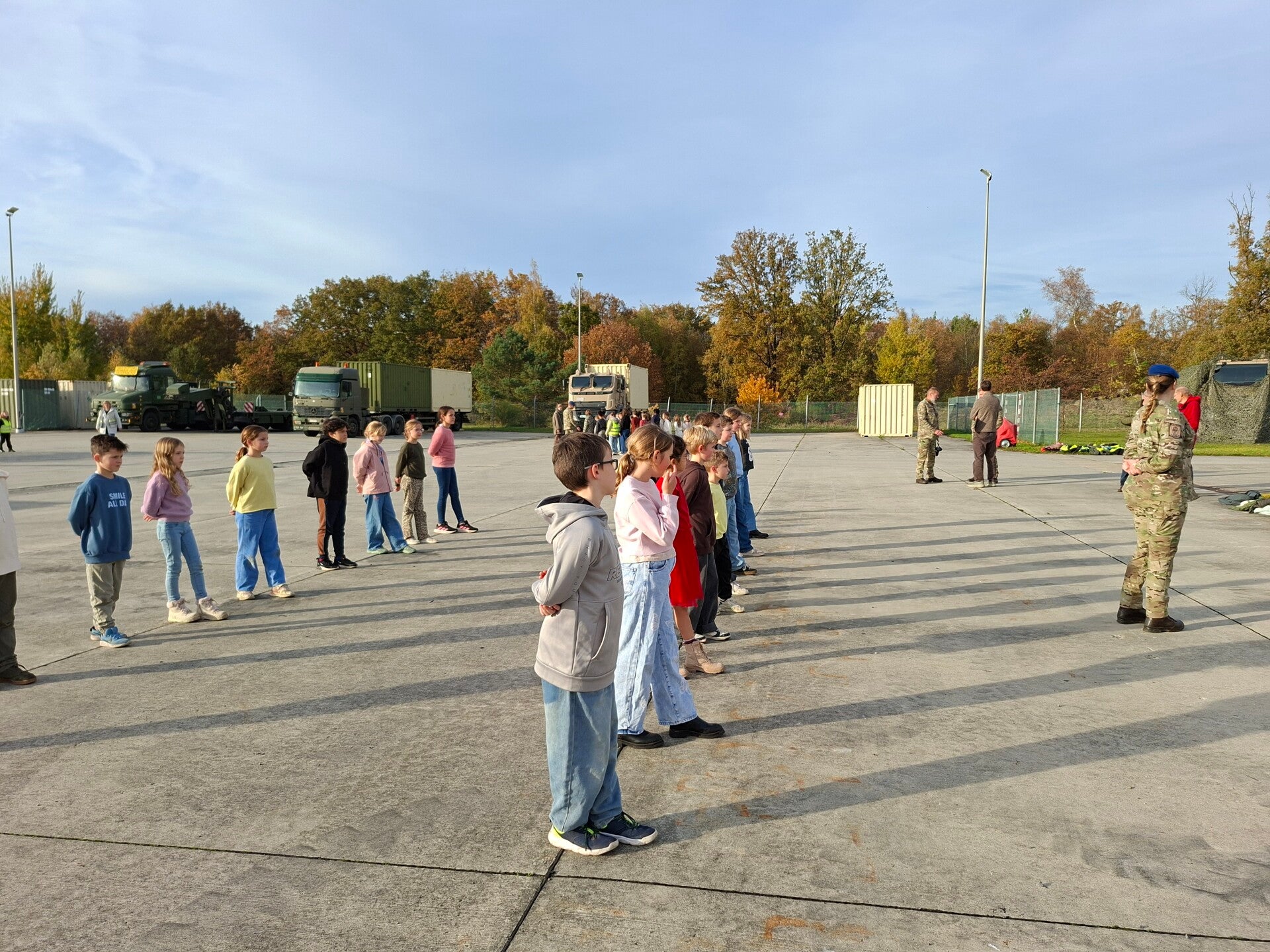 Daarna trokken we naar de legerkazerne, waar we heel wat bijleerden over de twee wereldoorlogen. We mochten zelfs deelnemen aan een driloefening en plaatsnemen in een echte legervrachtwagen — dat was pas spannend!