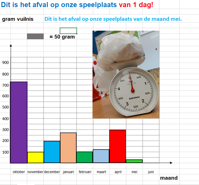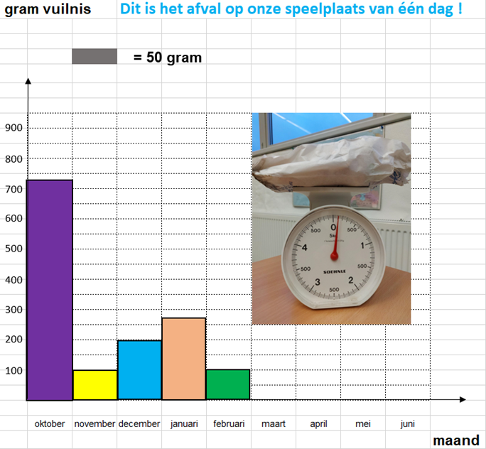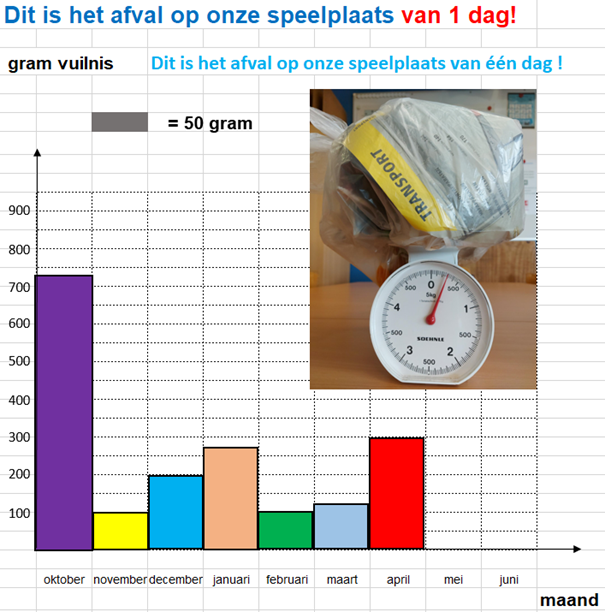 Iedere maand wordt er een steekproef gedaan. De moskes halen het vuilnis op en wegen het. Daarna stellen ze het resultaat voor in een staafdiagram. In oktober waren de opruimers zeer teleurgesteld: er lag 750 g afval op de speelplaats!