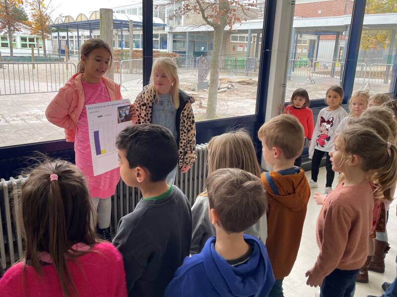De moskes gingen alle kleuters en leerlingen op de hoogte brengen van het resultaat. Ze gaven hen een groot compliment. Daarna gingen ze affiches verspreiden in de school zodat iedereen het resultaat kan volgen. Volgende maand komt er weer een staaf bij!